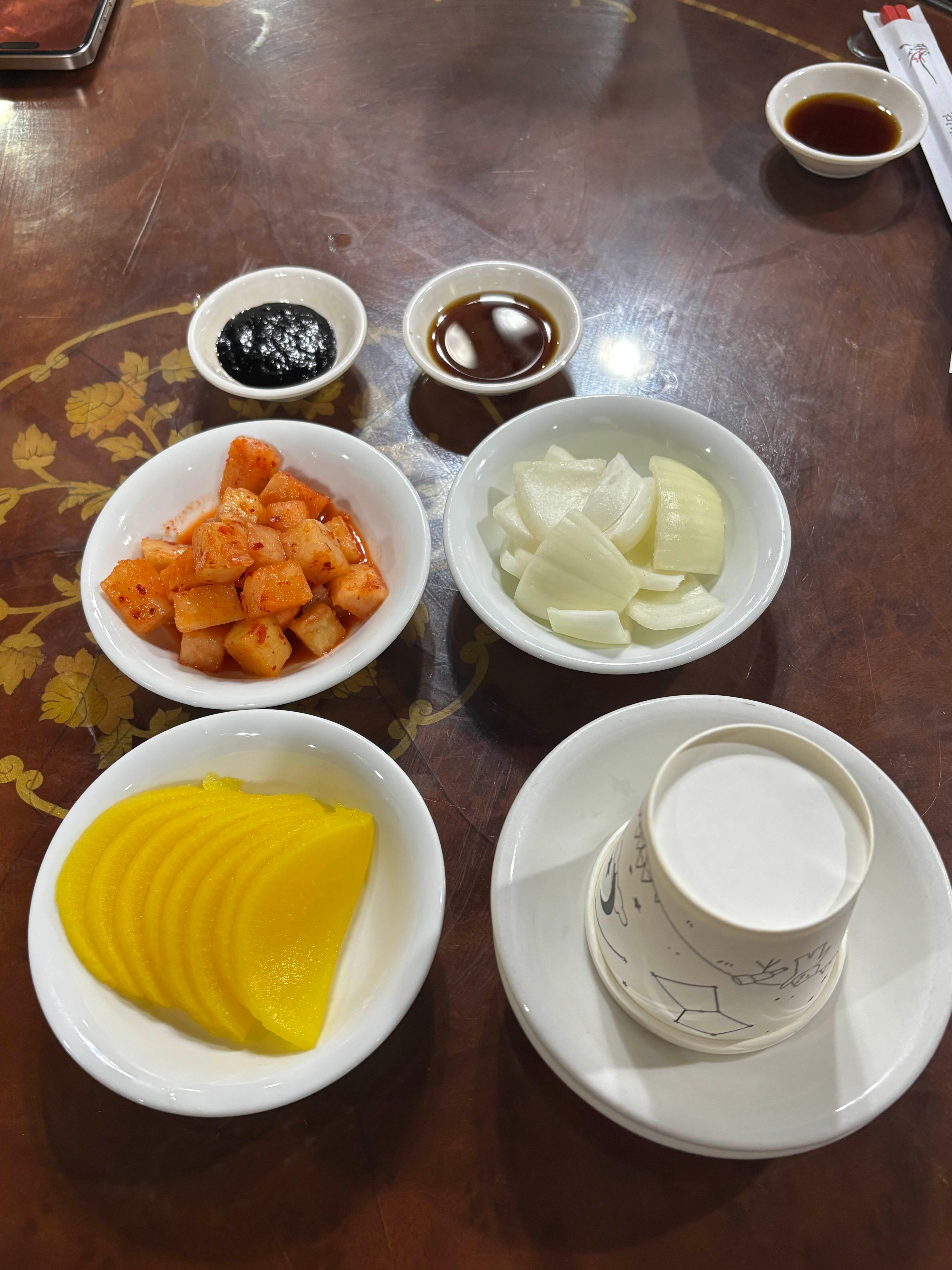 기본찬은 깍두기 ,단무지,양파,춘장,간장